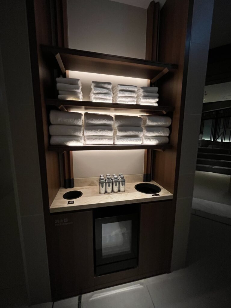 入り口にはタオル、お水が置いてある。お水は冷水と常温の2種類用意されている。