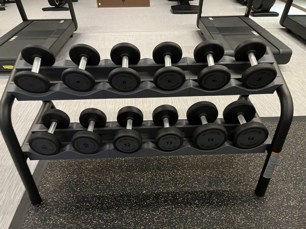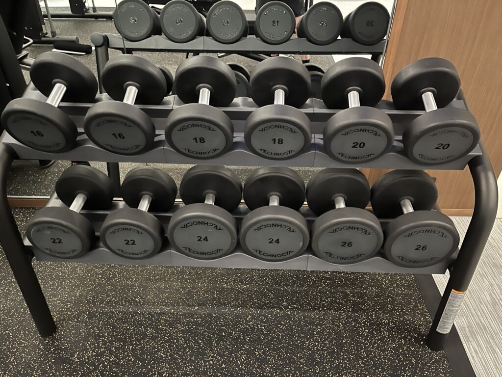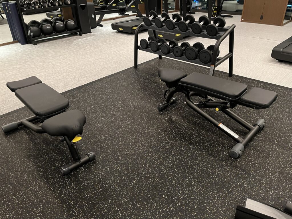 ダンベルも4キロから2キロ刻みで26キロまであり、一般的なトレーニングはできる。可変式ベンチも2台。