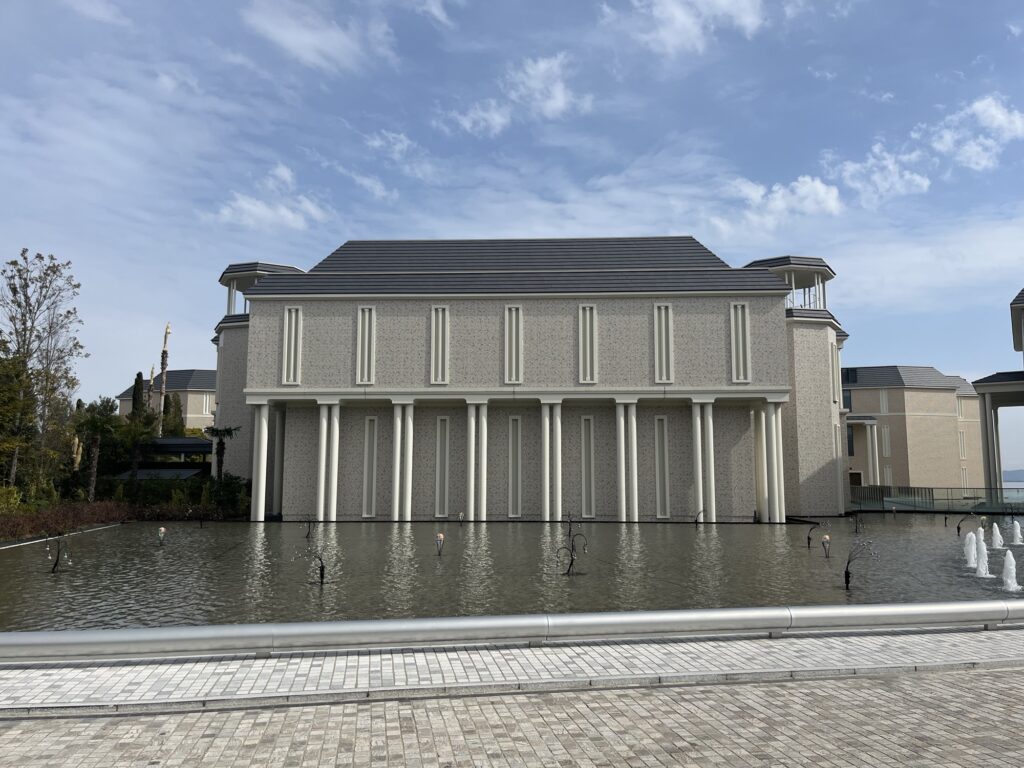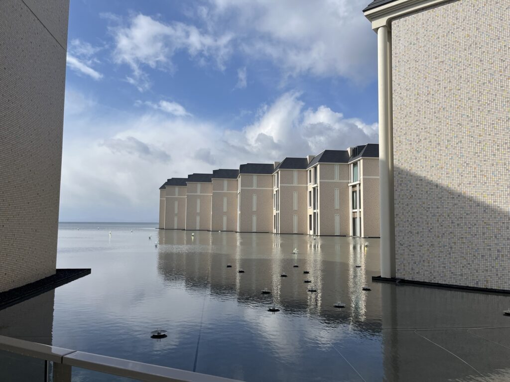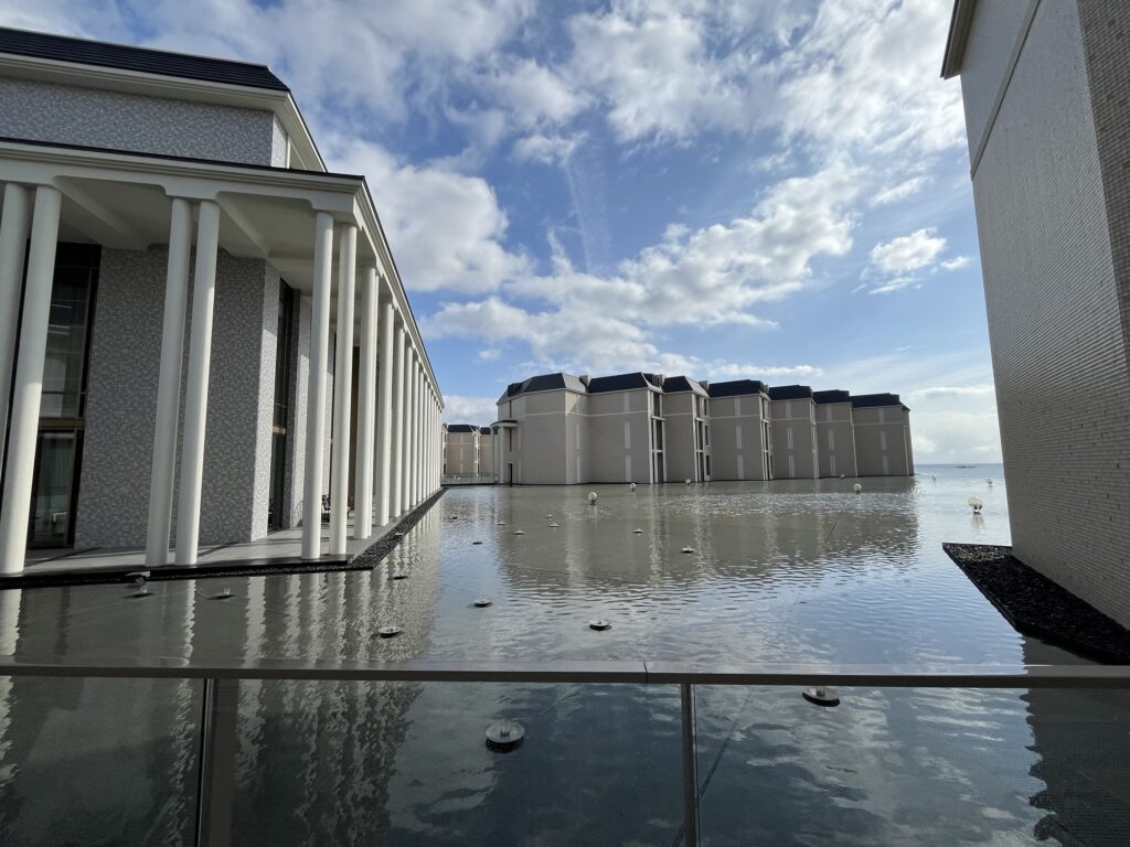 また「モダンベネチアンリゾート」と銘打った水上都市ベチネアをイメージしており、水上に浮かび上がるような建物の設計になっている。