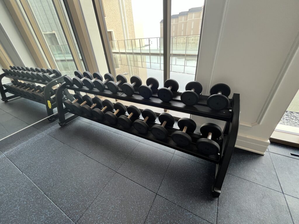 ダンベルは2キロ刻みで22キロまであり、その横に可変式ベンチが1台ある。