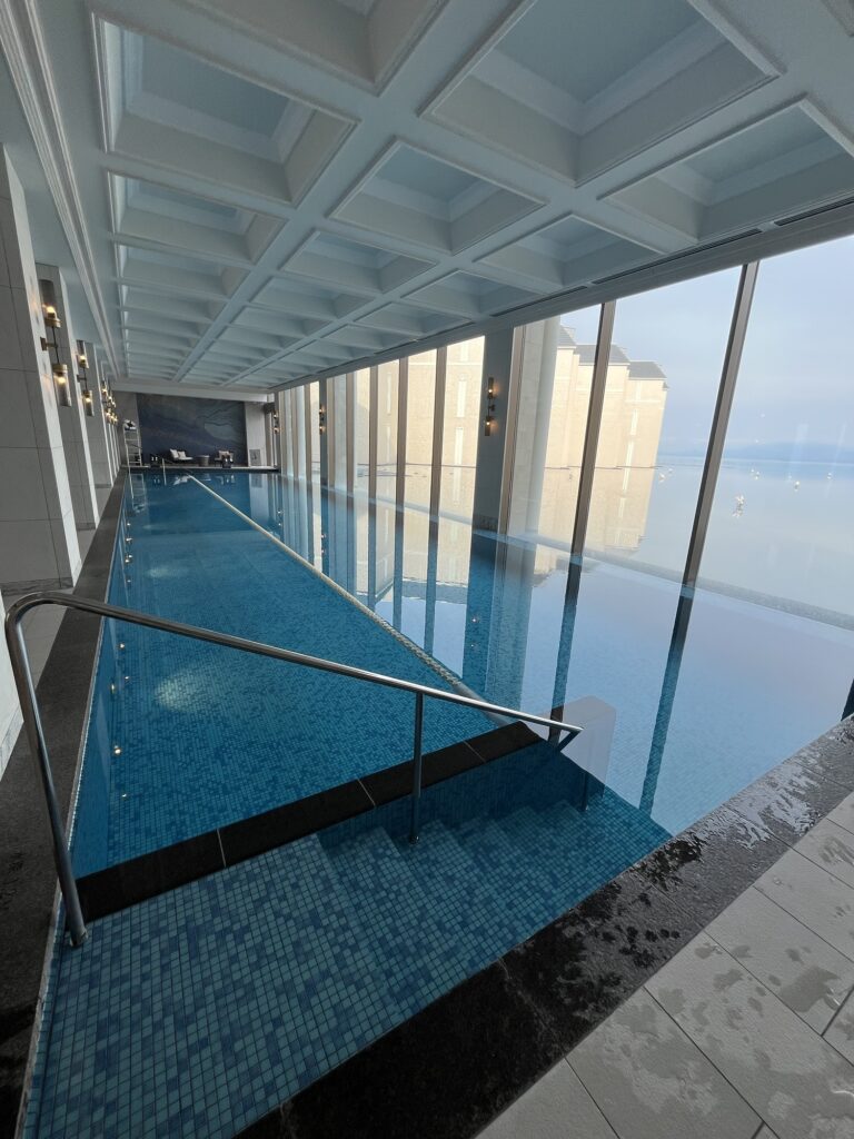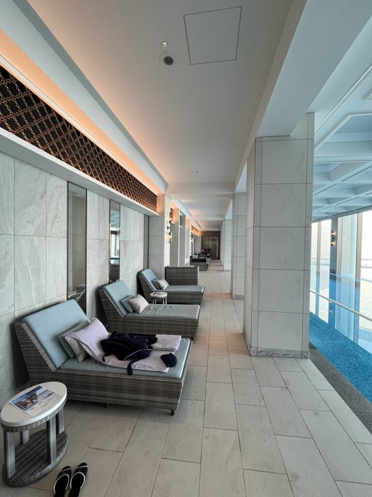 プールの室温は結構暖かめに設定されており、ガウンをきていると暑いくらい。水温も冷たくはなく、ちょうどいい温度。