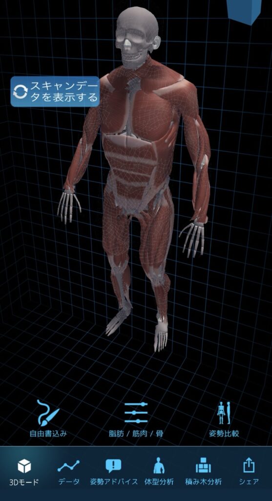 この中に入ってスキャンしてもらうと姿勢や各部位のサイズなどが測定でき、アプリをダウンロードすればスマホで見ることもできる。