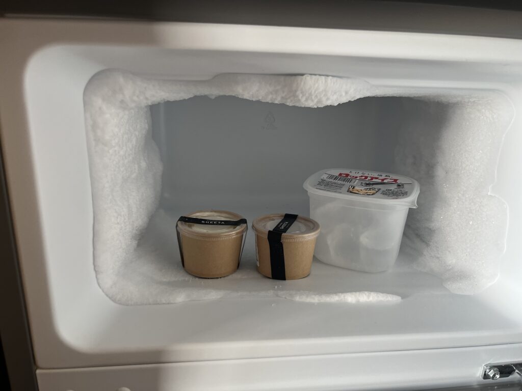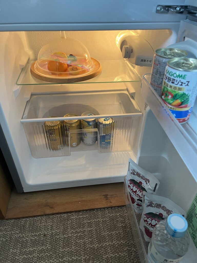 冷蔵庫内には簡単なウェルカムフルーツと飲み物、冷凍庫にはロックアイスとアイスを置いてくれていた。飲み物はリンゴジュース、水、野菜ジュース、ビール、酎ハイ。