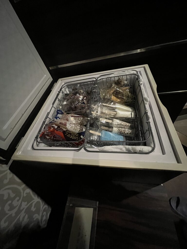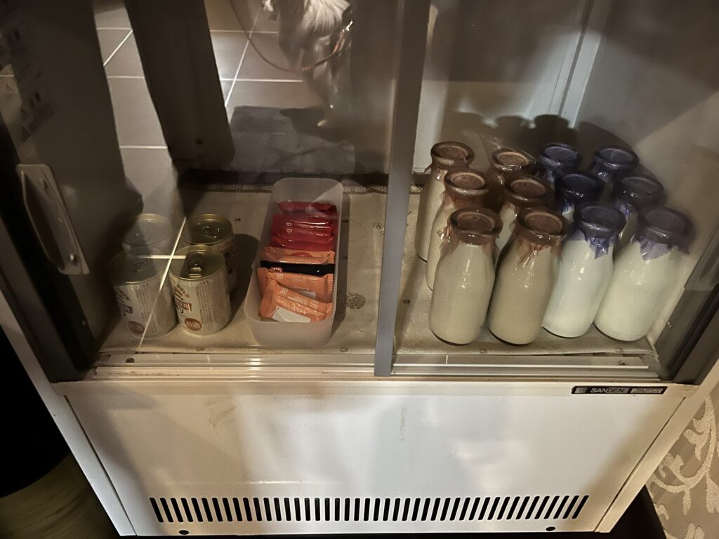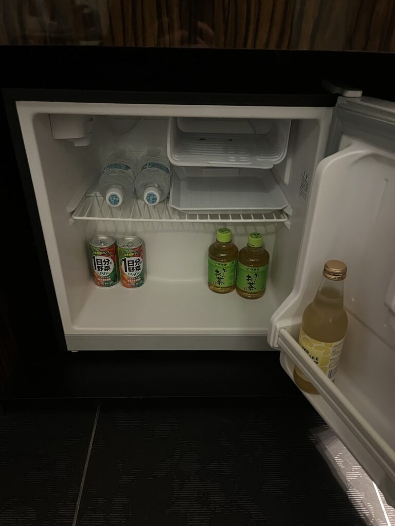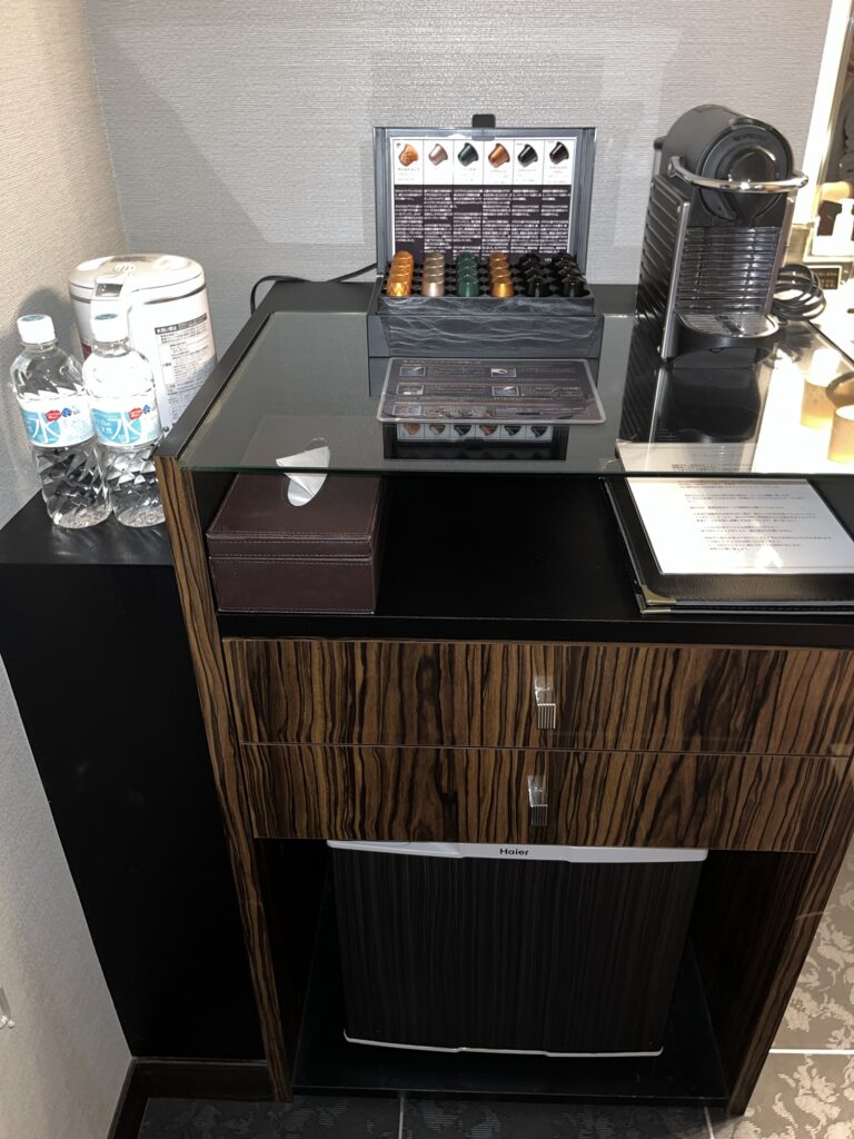 ミニバーにはコーヒーカプセルが20個くらいあり充実している。冷蔵庫には飲み物がいくつか入っている(無料)。