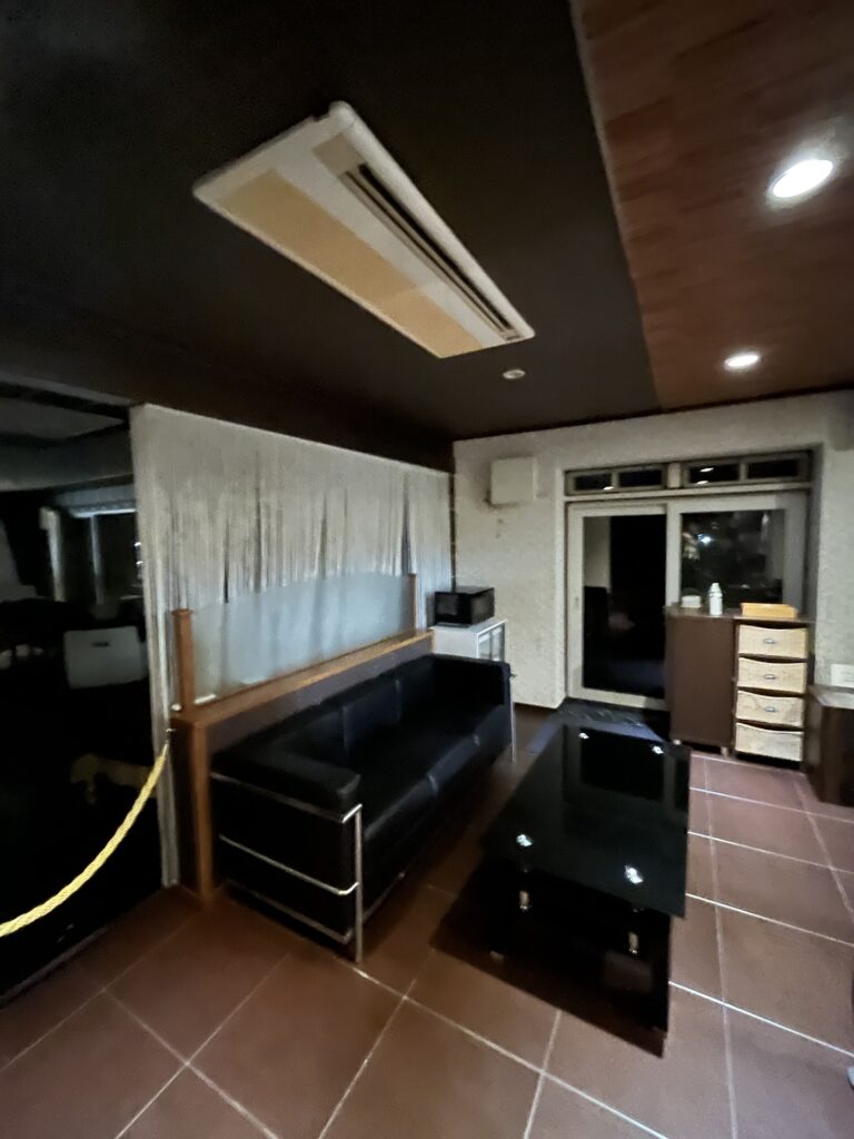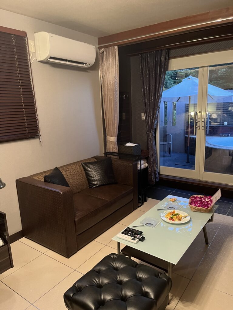だいたい60平米くらい。リビングと寝室の2部屋。外には露天のお風呂とシャワーもある。