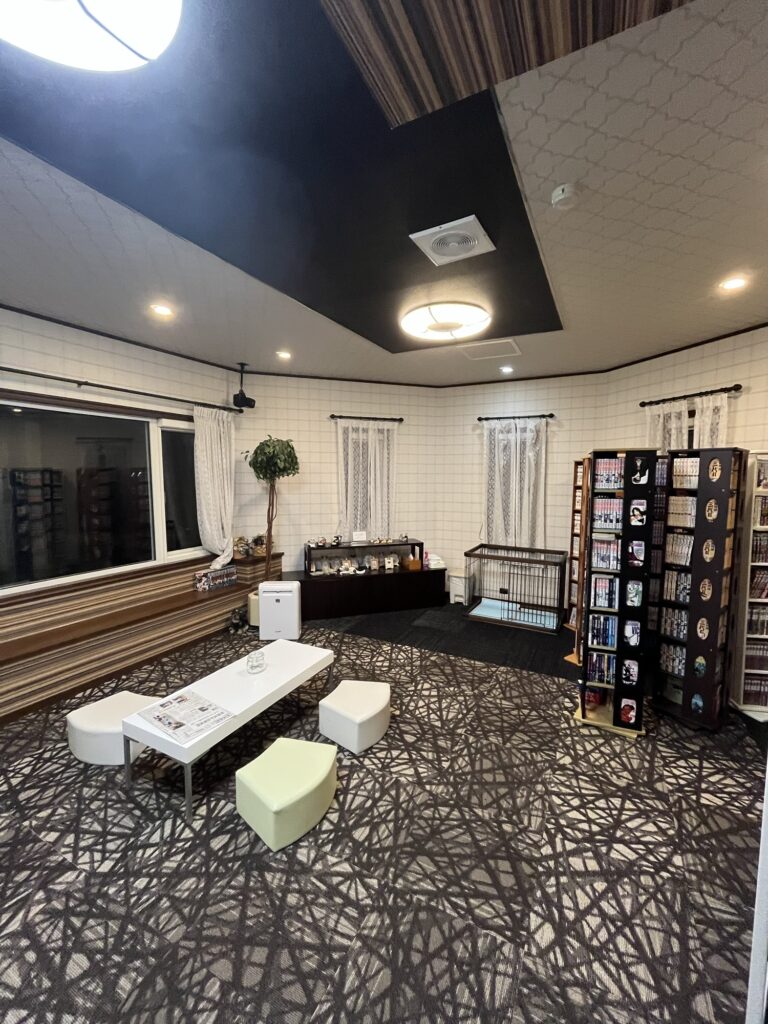 漫画やDVDが置いてあり、ここで読んでもいいし、お部屋に持って帰って読んでもよい。