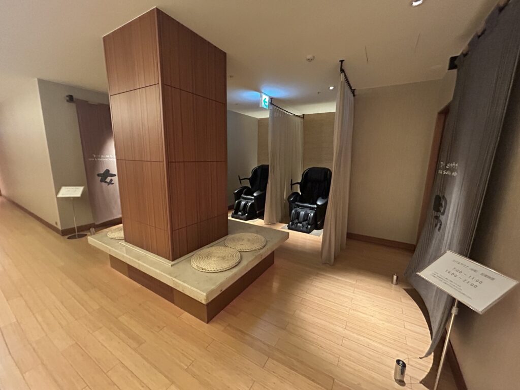入り口を入るとマッサージチェアが2台置いてあり、男湯と女湯に別れる。