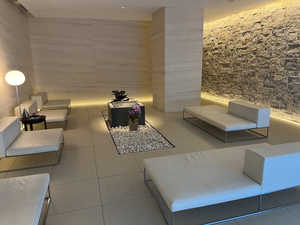 白を基調としたおしゃれな廊下を通っていくとロビーラウンジとフロントがある。