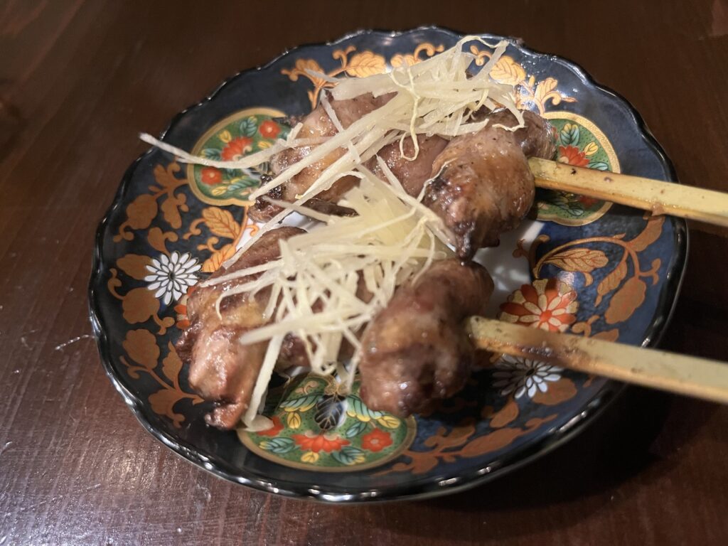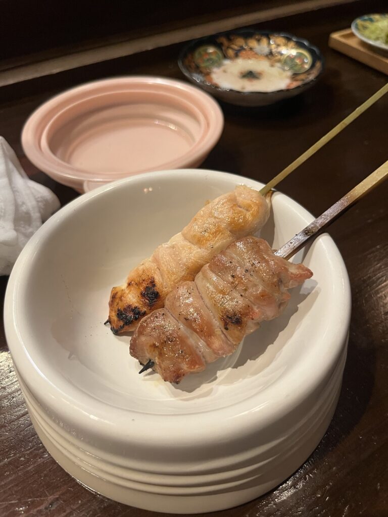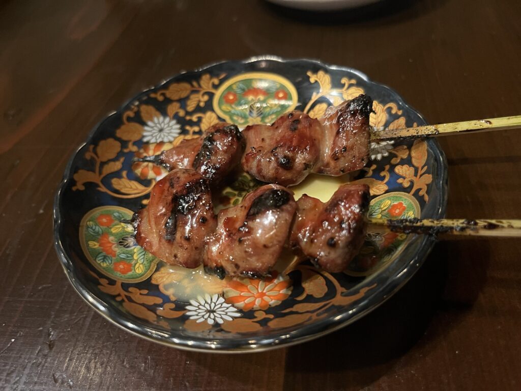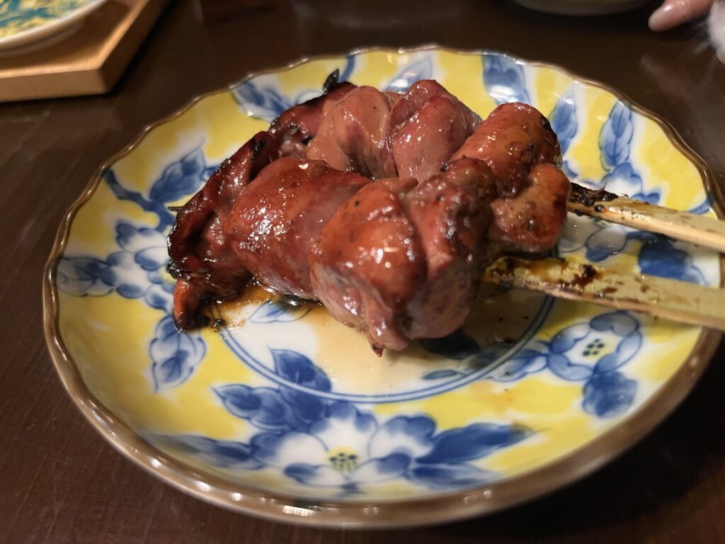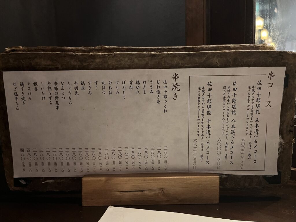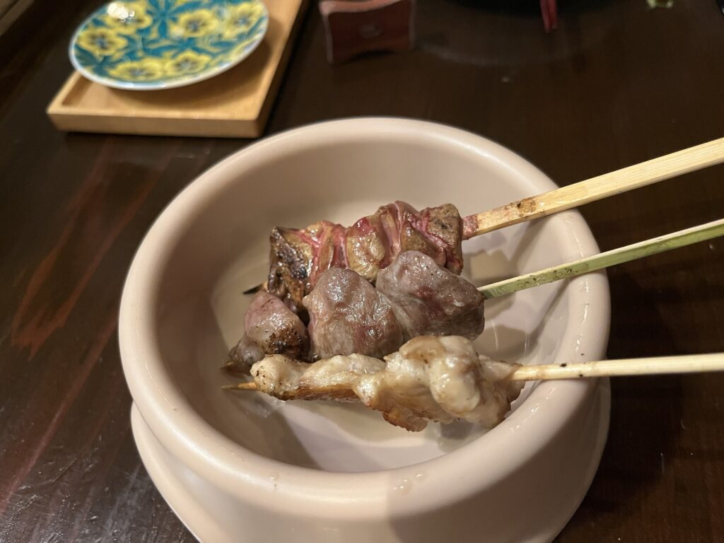 中目黒駅前という好立地ながら価格もリーズナブル。今回は串コース10本を注文。先付けと締めのご飯、デザートも付く。