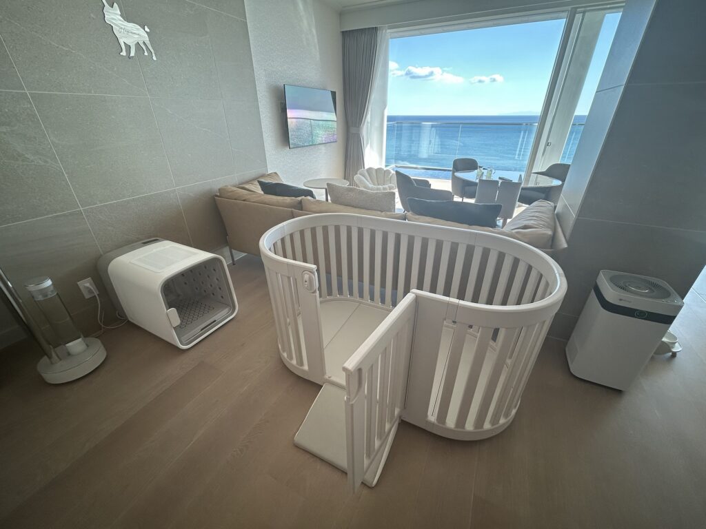 ワンちゃんの備品も揃っている。ゲージもおしゃれだし、左にある箱みたいなものはエアシャワーらしい。結構珍しいものだとスタッフさんが言っていた。