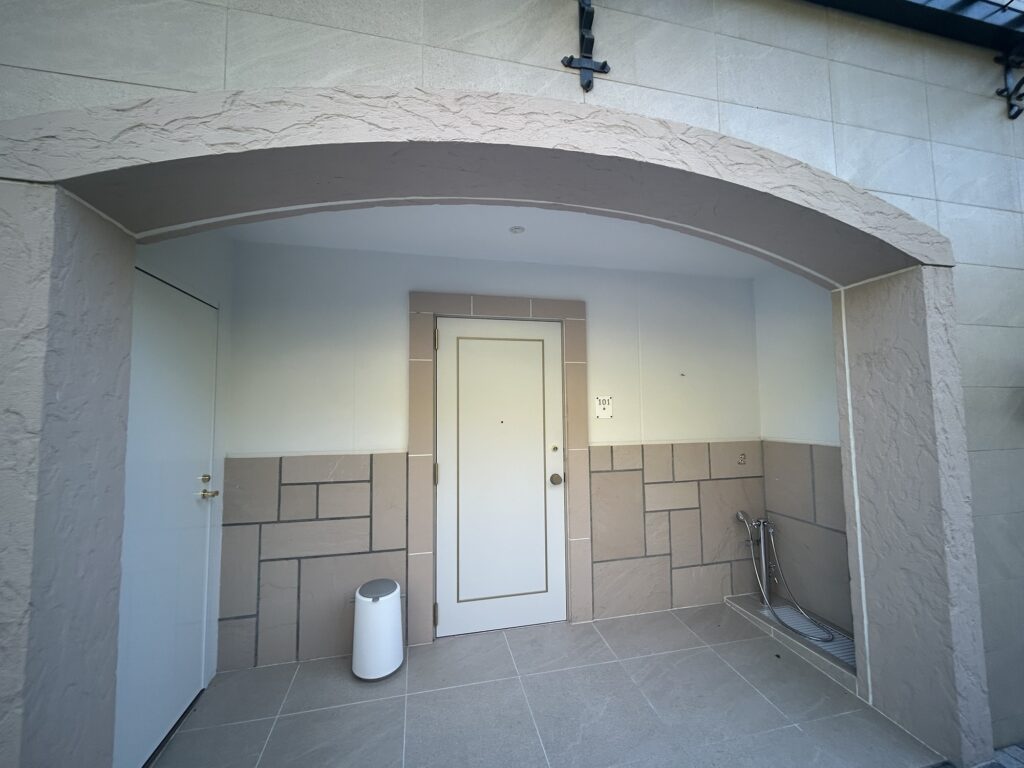 部屋は101号室で、ホテル入り口の場所からそのまま10mほどまっすぐ進むと道路に沿って101号室の入り口がある。車を目の前に停めてそのままお部屋に入れる構造で、そう言う意味でもチェックインからペットフレンドリーである。