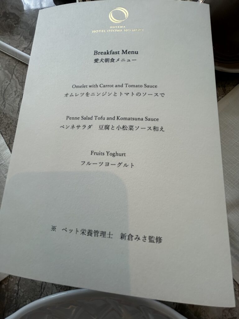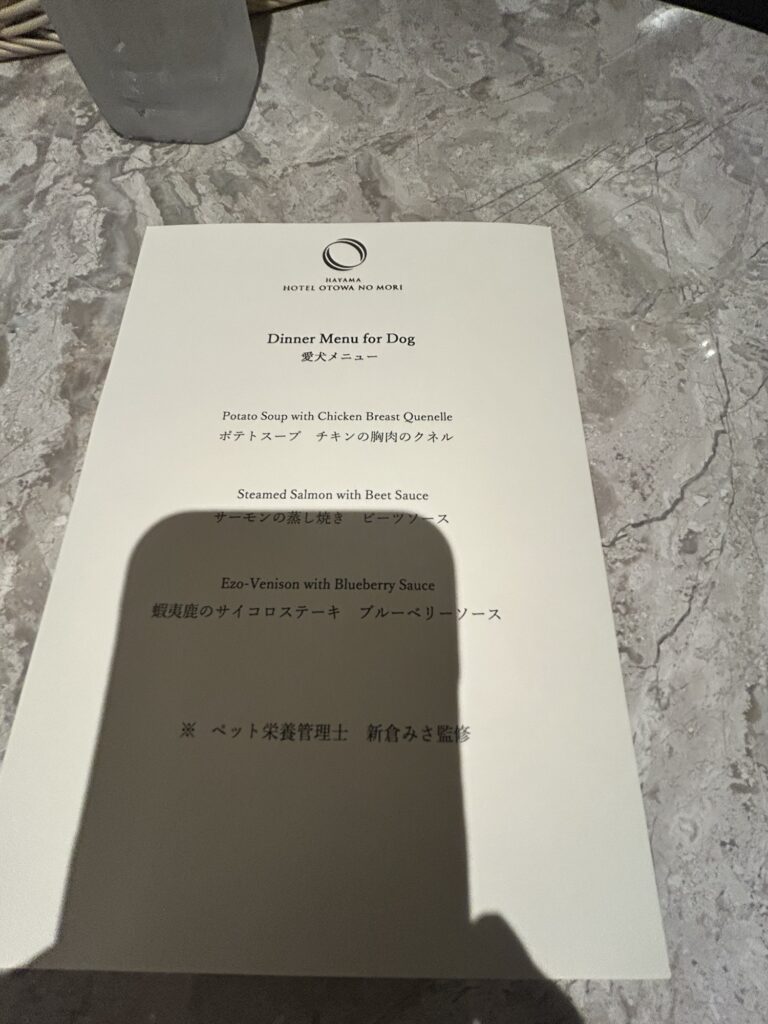 食事は夕食、朝食付きのプランにした。いずれもお部屋に食事を持ってきてもらえ、ペットと一緒に食べる事ができる。