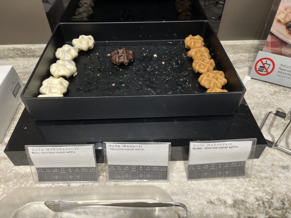 ANAラウンジは食べ物がチョコとおかきくらいしかないため、軽食の有無が違う。