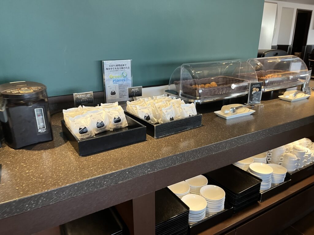 食べ物はおにぎりが2種類、パンが2-3種類とスープ・お味噌汁くらい。