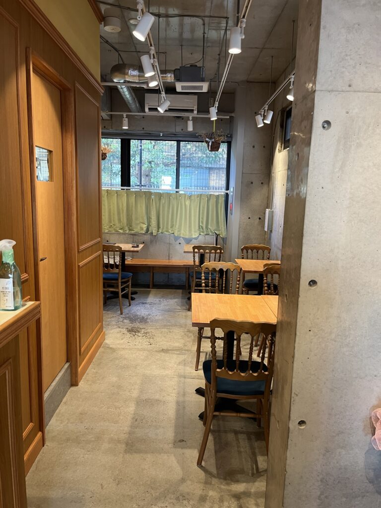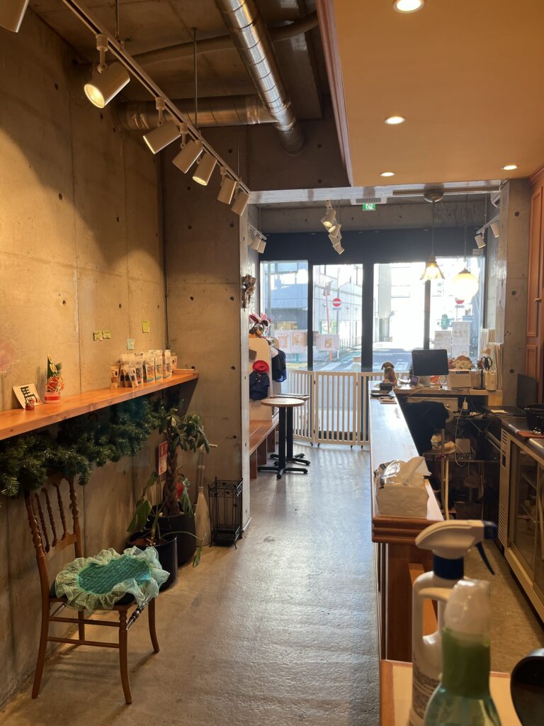木目調の落ち着くお店。席は6席ほど。店内をワンちゃんがノーリードで自由に歩き回れるというペットフレンドリーさ。