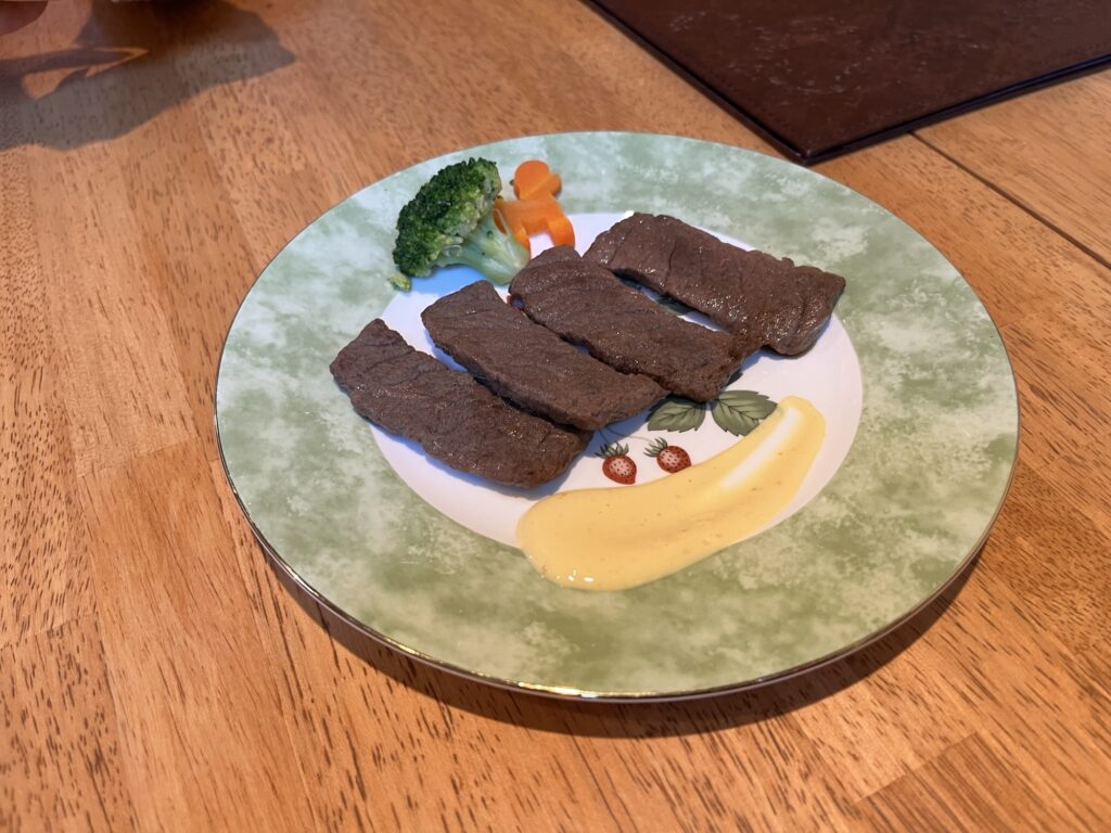 なんかすごくいい皿で来た。しかも肉も人間が食べれるレベル(ちょっと食べてみた)。