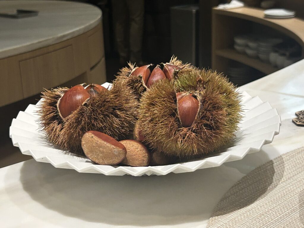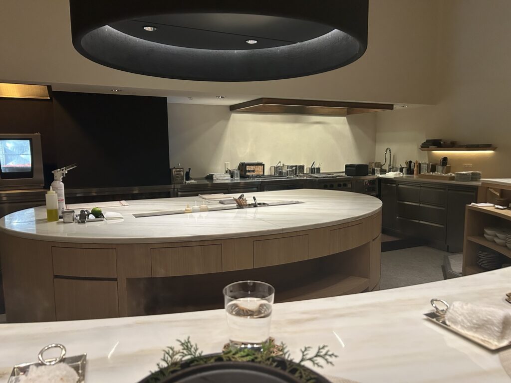 時間になると隣のお部屋に案内される。席は10名席でキッチンを囲む形で配置されている。とてもおしゃれで映える。